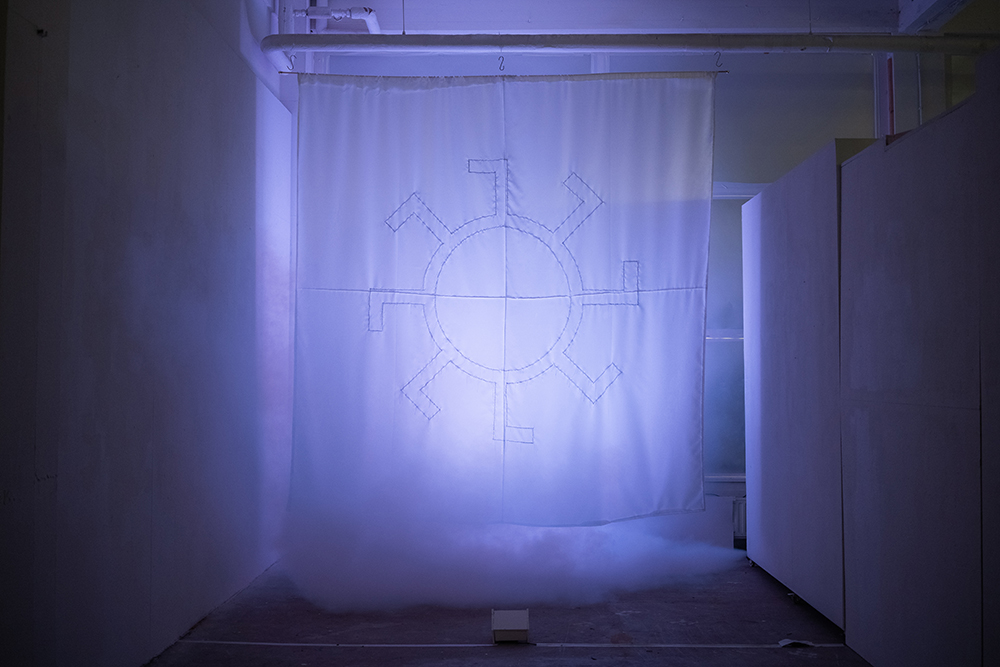 “CULT! The Flag”; 2020, visual and sound installation, hand-embroidered flag 3x3m